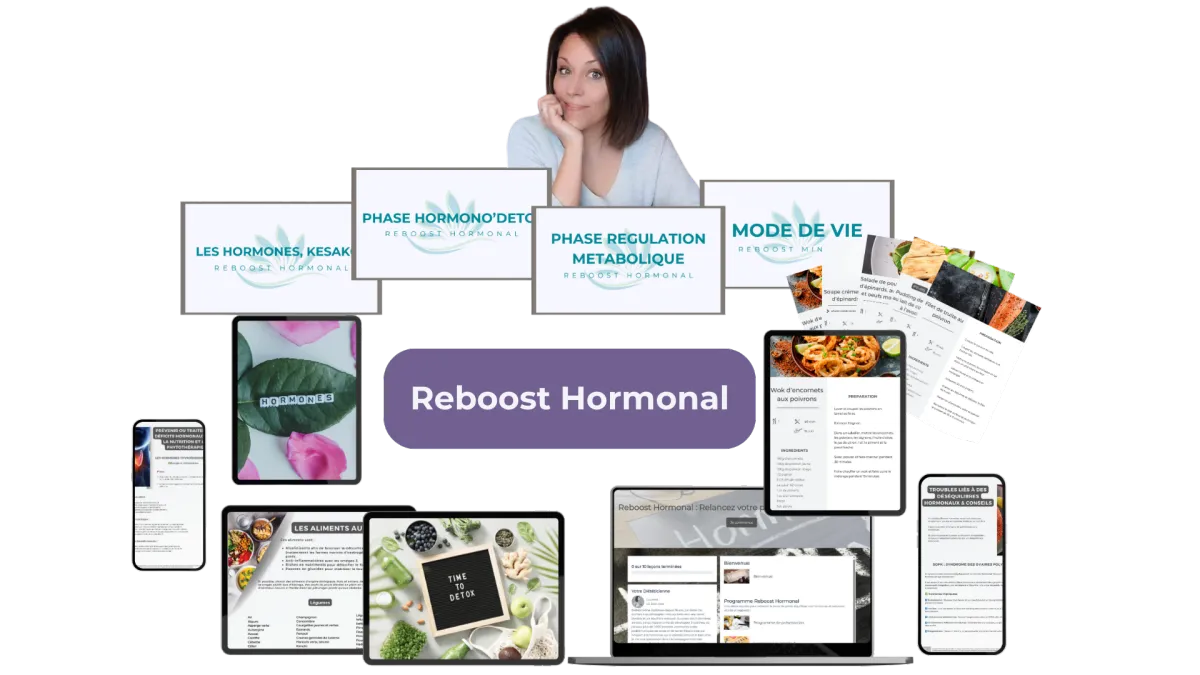 Elle a donc créé Reboost Hormonal : une méthode 100 % naturelle, sans régimes extrêmes, sans compléments inutiles, basée sur la nutrition hormonale.